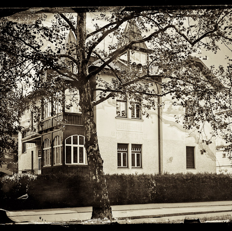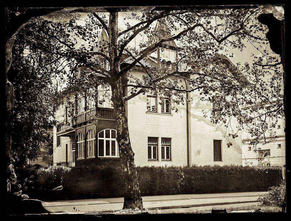 Posnetek s tivolske smeri fasado hiše nekoliko skrije z drevesnimi vejami. Deblo in veje platane v harmoničnem razmerju poudarita kompozicijo fotografije, organske linije drevesa pa razbijejo geometrijske arhitekturne oblike in poetično zmehčajo prizor. Drevo v prvem planu hkrati postane prispodoba življenja, življenjske moči in rasti, v povezavi z družinsko hišo v drugem planu ga lahko interpretiramo tudi kot prispodobo rodbine. Naključni obrisi na robu posnetka, ki nastajajo pri ročnem nanašanju kemičnih substanc na steklo, poudarjajo pridih pravljičnosti in čarobnosti.